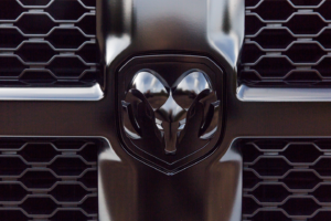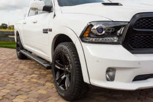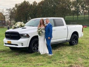 Een beetje stoer bruidspaar maakt hun trouwdag compleet met het huren van een Dodge RAM 5.7 Hemi.